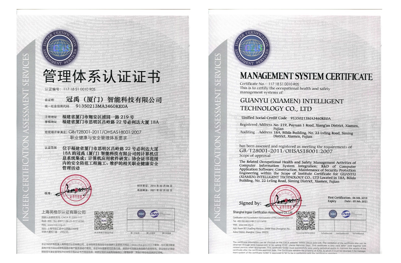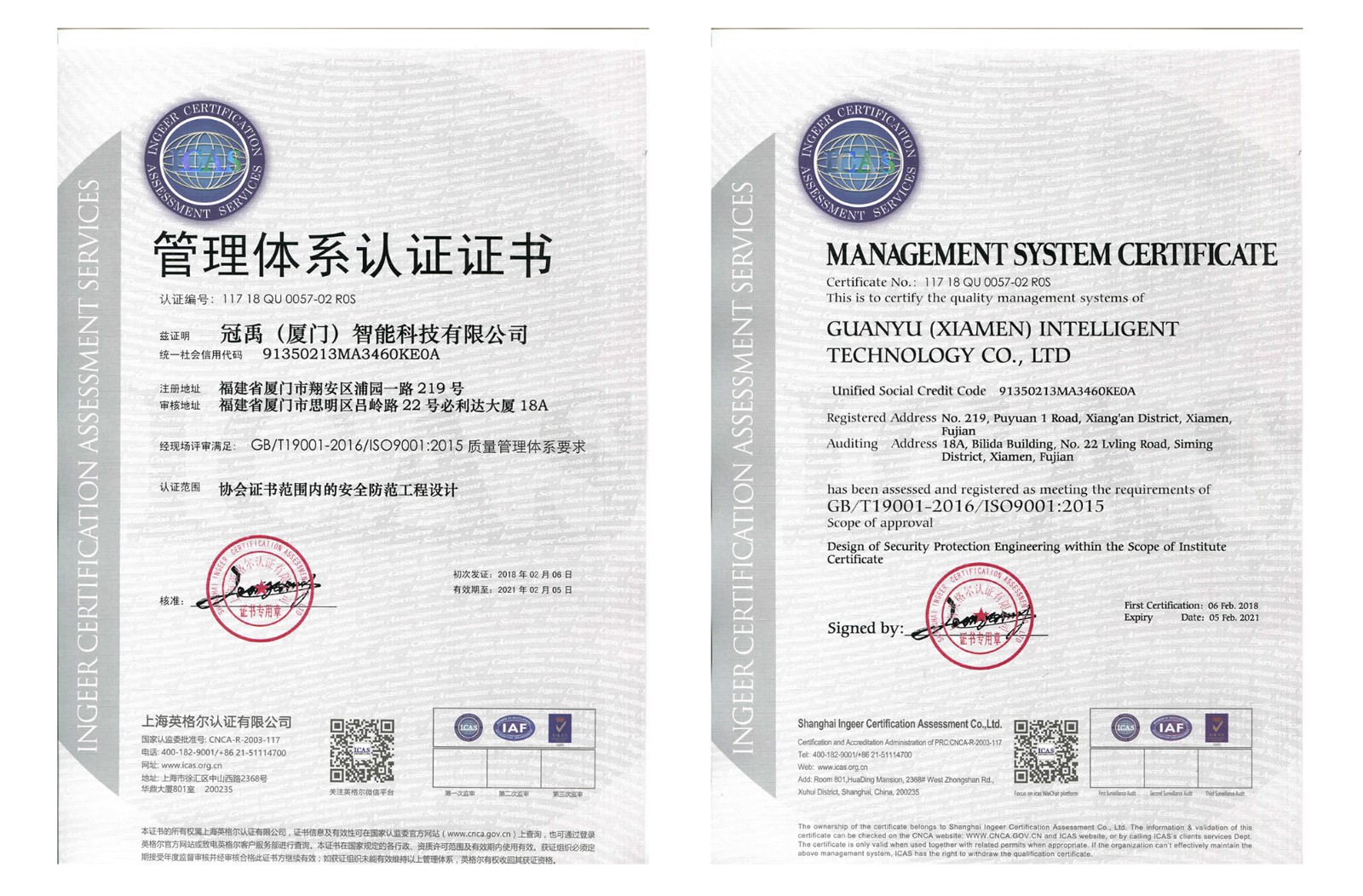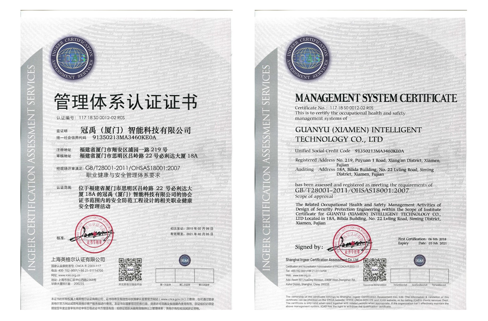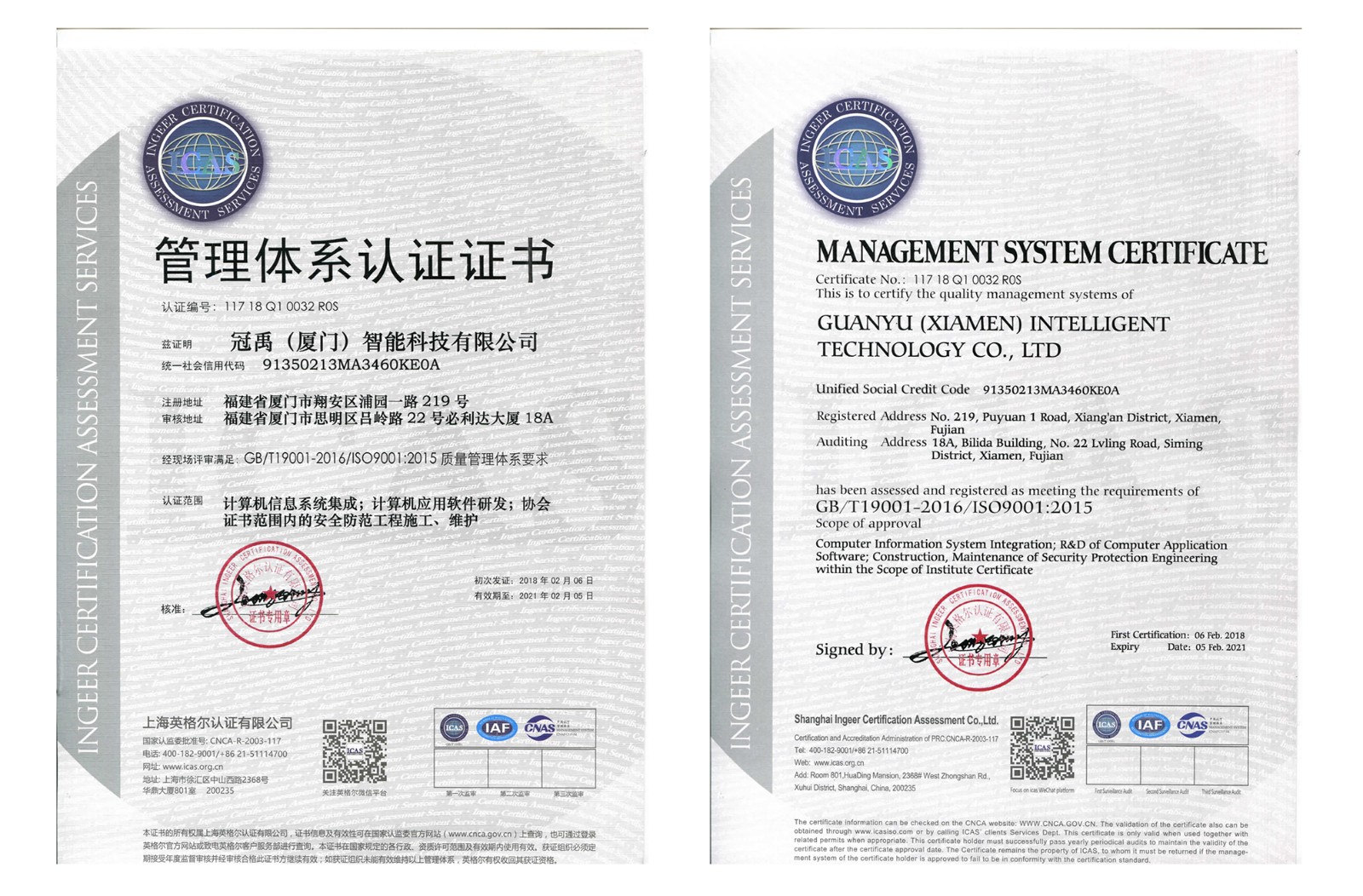 本次認(rèn)證公告的發(fā)布,標(biāo)志著我公司質(zhì)量管理、職業(yè)健康與安全管理全面通過(guò)雙體系認(rèn)證,這證明冠禹(廈門(mén))智能科技有限公司的計(jì)算機(jī)信息系統(tǒng)集成、計(jì)算機(jī)應(yīng)用軟件研發(fā)、安全防范工程設(shè)計(jì)、施工、維護(hù)的管理制度、技術(shù)力量經(jīng)受住了“史上較嚴(yán) 雙體系 ”的認(rèn)證大考,標(biāo)志著冠禹(廈門(mén))智能科技有限公司質(zhì)量體系、職業(yè)健康與安全體系水平達(dá)到了國(guó)家規(guī)定的新標(biāo)準(zhǔn),為企業(yè)在當(dāng)前激烈的市場(chǎng)競(jìng)爭(zhēng)中贏(yíng)得了機(jī)會(huì),更為企業(yè)快速發(fā)展打下了堅(jiān)實(shí)基礎(chǔ)。
